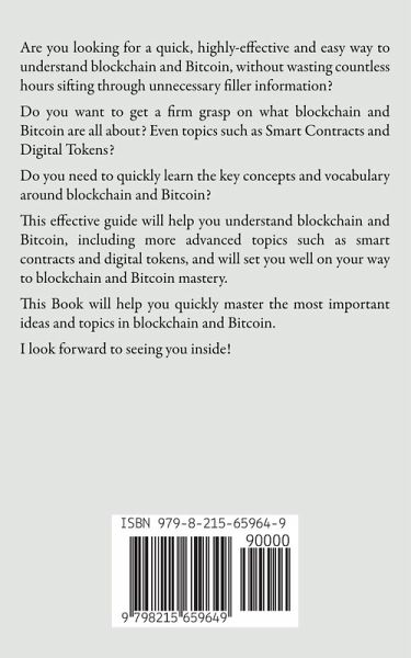 Are you looking for a quick, highly-effective and easy way to understand blockchain and Bitcoin, without wasting countless hours sifting through unnecessary filler information? Do you want to get a firm grasp on what blockchain and Bitcoin are all about? Even topics such as Smart Contracts and Digital Tokens? Do you need to quickly learn the key concepts and vocabulary around blockchain and Bitcoin? This effective guide will help you understand blockchain and Bitcoin, including more advanced topics such as smart contracts and digital tokens, and will set you well on your way to blockchain and Bitcoin mastery. This Book will help you quickly master the most important ideas and topics in blockchain and Bitcoin. I look forward to seeing you inside!