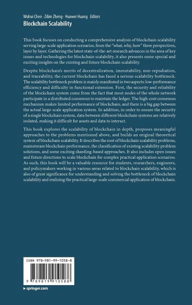 This book explores the scalability of blockchain in depth, proposes meaningful approaches to the problems mentioned above, and builds an original theoretical system of blockchain scalability. It describes the root of blockchain scalability problems, mainstream blockchain performance, the classification of existing scalability problem solutions, and some exciting sharding-based approaches. It also includes open issues and future directions to scale blockchain for complex practical application scenarios. As such, this book will be a valuable resource for students, researchers, engineers, and policymakers working in various areas related to blockchain scalability, which is also of great significance for understanding and solving the bottleneck of blockchain scalability and realizing the practical large-scale commercial application of blockchain.