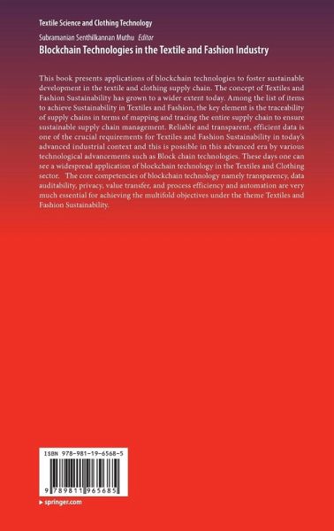 This book presents applications of blockchain technologies to foster sustainable development in the textile and clothing supply chain. The concept of Textiles and Fashion Sustainability has grown to a wider extent today. Among the list of items to achieve Sustainability in Textiles and Fashion, the key element is the traceability of supply chains in terms of mapping and tracing the entire supply chain to ensure sustainable supply chain management. Reliable and transparent, efficient data is one of the crucial requirements for Textiles and Fashion Sustainability in today's advanced industrial context and this is possible in this advanced era by various technological advancements such as Block chain technologies. These days one can see a widespread application of blockchain technology in the Textiles and Clothing sector. The core competencies of blockchain technology namely transparency, data auditability, privacy, value transfer, and process efficiency and automation are verymuch essential for achieving the multifold objectives under the theme Textiles and Fashion Sustainability.