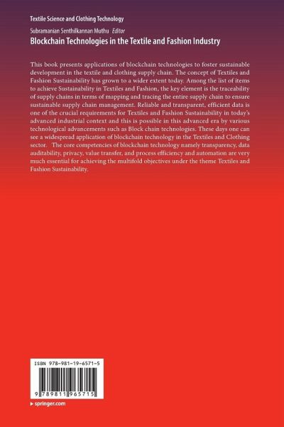 This book presents applications of blockchain technologies to foster sustainable development in the textile and clothing supply chain. The concept of Textiles and Fashion Sustainability has grown to a wider extent today. Among the list of items to achieve Sustainability in Textiles and Fashion, the key element is the traceability of supply chains in terms of mapping and tracing the entire supply chain to ensure sustainable supply chain management. Reliable and transparent, efficient data is one of the crucial requirements for Textiles and Fashion Sustainability in today's advanced industrial context and this is possible in this advanced era by various technological advancements such as Block chain technologies. These days one can see a widespread application of blockchain technology in the Textiles and Clothing sector. The core competencies of blockchain technology namely transparency, data auditability, privacy, value transfer, and process efficiency and automation are verymuch essential for achieving the multifold objectives under the theme Textiles and Fashion Sustainability.