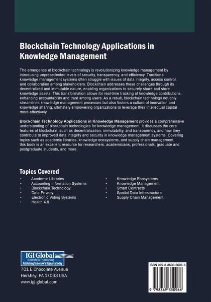 The emergence of blockchain technology is revolutionizing knowledge management by introducing unprecedented levels of security, transparency, and efficiency. Traditional knowledge management systems often struggle with issues of data integrity, access control, and collaboration among stakeholders. Blockchain addresses these challenges through its decentralized and immutable nature, enabling organizations to securely share and store knowledge assets. This transformation allows for real-time tracking of knowledge contributions, enhancing accountability and trust among users. As a result, blockchain technology not only streamlines knowledge management processes but also fosters a culture of innovation and knowledge sharing, ultimately empowering organizations to leverage their intellectual capital more effectively. Blockchain Technology Applications in Knowledge Management provides a comprehensive understanding of blockchain technologies for knowledge management. It discusses the core features of blockchain, such as decentralization, immutability, and transparency, and how they contribute to improved data integrity and security in knowledge management systems. Covering topics such as academic libraries, knowledge ecosystems, and supply chain management, this book is an excellent resource for researchers, academicians, professionals, graduate and postgraduate students, and more.