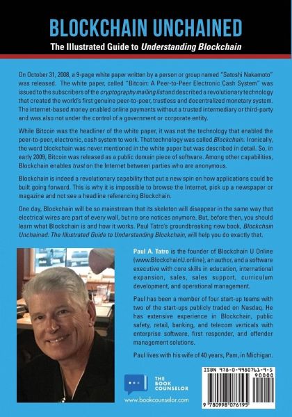 On October 31, 2008, a 9-page white paper written by a person or group named "Satoshi Nakamoto" was released. The white paper, called "Bitcoin: A Peer-to-Peer Electronic Cash System" was issued to the subscribers of the cryptography mailing list and described a revolutionary technology that created the world's first genuine peer-to-peer, trustless and decentralized monetary system. The internet-based money enabled online payments without a trusted intermediary or third-party and was also not under the control of a government or corporate entity. While Bitcoin was the headliner of the white paper, it was not the technology that enabled the peer-to-peer, electronic, cash system to work. That technology was called Blockchain. Ironically, the word blockchain was never mentioned in the white paper but was described in detail. So, in early 2009, Bitcoin was released as a public domain piece of software. Among other capabilities, Blockchain enables trust on the Internet between parties who are anonymous. Blockchain is indeed a revolutionary capability that put a new spin on how applications could be built going forward. This is why it is impossible to browse the Internet, pick up a newspaper or magazine and not see a headline referencing Blockchain. One day, Blockchain will be so mainstream that its skeleton will disappear in the same way that electrical wires are part of every wall, but no one notices anymore. But, before then, you should learn what Blockchain is and how it works. Paul Tatro's groundbreaking new book, Blockchain Unchained: The Illustrated Guide to Understanding Blockchain, will help you do exactly that.