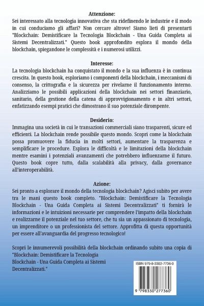 Sei interessato alla tecnologia innovativa che sta ridefinendo le industrie e il modo in cui conduciamo gli affari? Non cercare altrove! Siamo lieti di presentarti "Blockchain: Demistificare la Tecnologia Blockchain - Una Guida Completa ai Sistemi Decentralizzati." Questo book approfondito esplora il mondo della blockchain, spiegandone le complessità e i numerosi utilizzi. La tecnologia blockchain ha conquistato il mondo e la sua influenza è in continua crescita. In questo book, esploriamo i componenti della blockchain, i meccanismi di consenso, la crittografia e la sicurezza per rivelarne il funzionamento interno. Analizziamo le possibili applicazioni della blockchain nei settori finanziario, sanitario, della gestione della catena di approvvigionamento e in altri settori, enfatizzando esempi pratici che dimostrano il suo potenziale dirompente. Immagina una società in cui le transazioni commerciali siano trasparenti, sicure ed efficienti. La blockchain rende possibile questo mondo. Scopri come la blockchain possa promuovere la fiducia in molti settori, aumentare la trasparenza e semplificare le procedure. Esplora le difficoltà e le limitazioni della blockchain mentre esamini i potenziali avanzamenti che potrebbero influenzarne il futuro. Questo book copre tutto, dalla scalabilità alla privacy, dalla governance all'interoperabilità. Sei pronto a esplorare il mondo della tecnologia blockchain? Agisci subito per avere tra le mani questo book completo. "Blockchain: Demistificare la Tecnologia Blockchain - Una Guida Completa ai Sistemi Decentralizzati" ti fornirà le informazioni e le intuizioni necessarie per comprendere l'impatto della blockchain e realizzarne il potenziale nel tuo settore, che tu sia un appassionato di tecnologia, un imprenditore o un professionista del settore. Approfitta di questa opportunità per essere all'avanguardia del progresso tecnologico! Scopri le innumerevoli possibilità della blockchain ordinando subito una copia di "Blockchain: Demistificare la Tecnologia Blockchain - Una Guida Completa ai Sistemi Decentralizzati."