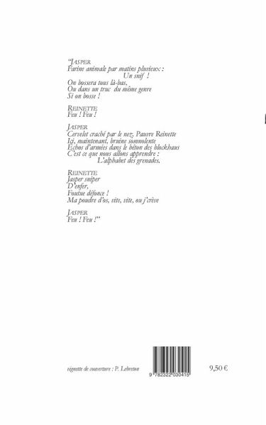 Jasper aura 17ans dans 8 jours, son amie Reinette en a 16 et demi.Le drame se déroule aujourd'hui.Il fait partie de ceux dont on se dit après-coup : "C'est incompréhensible ! Comment de telles horreurs peuvent-elles survenir ? Et sans que l'on n'ait rien vu venir ! Ces jeunes gens paraissaient si normaux..."Jasper :Farine animale par matins pluvieux :Un snif !On bossera tous là-bas, ou dans un truc du même genreSi on bosse !ReinetteFeu ! Feu !JasperCervelet craché par le nez. Pauvre ReinetteIci, maintenant, bruine somnolenteEchos d'armées dans le béton des blockhausC'est ce que nous allons apprendre :L'alphabet des grenades.ReinetteJasper sniperD'enfer,Foutue défonce !Ma poudre d'os, vite, vite, ou j'crèveJasperFeu ! Feu !