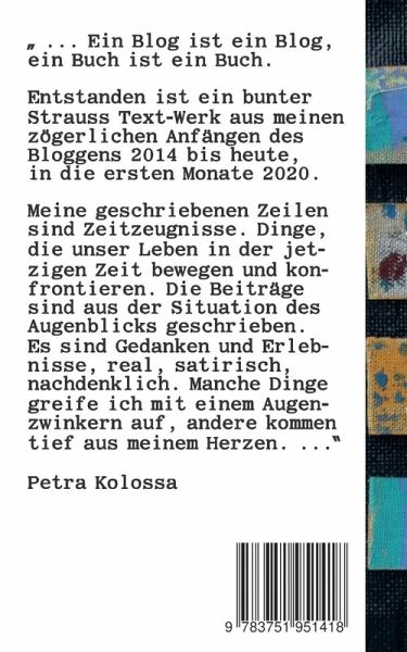 Meine geschriebenen Zeilen sind Zeitzeugnisse. Dinge, die unser Leben in der jetzigen Zeit bewegen und konfrontieren. (Petra Kolossa)Ihre Blog.Geschichten sind lesenswert, kurzweilig und treffen den Nerv der Zeit. Es sind Momentaufnahmen aus ihrem eigenen Leben. Kritisch, nachdenklich, geistreich und mit einer Portion Humor greift sie soziale, politische und alltägliche persönliche Themen auf und verpackt diese mit viel Empathie in ihre Texte.