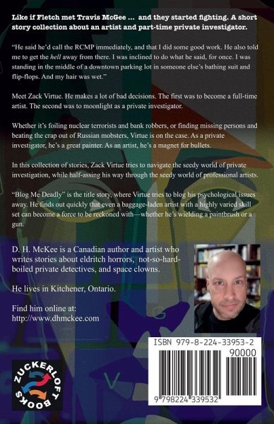 Like if Fletch met Travis McGee ... and they started fighting. A short story collection about an artist and part-time private investigator. "He said he'd call the RCMP immediately, and that I did some good work. He also told me to get the hell away from there. I was inclined to do what he said, for once. I was standing in the middle of a downtown parking lot in someone else's bathing suit and flip-flops. And my hair was wet." Meet Zack Virtue. He makes a lot of bad decisions. The first was to become a full-time artist. The second was to moonlight as a private investigator. Whether it's foiling nuclear terrorists and bank robbers, or finding missing persons and beating the crap out of Russian mobsters, Virtue is on the case. As a private investigator, he's a great painter. As an artist, he's a great magnet for bullets. Supporting him is Vijay Dhaliwal, a computer genius who throws the occasional security agency job his way. He tries to lure Virtue into the business, but our artist-turned-vet-turned-janitor-turned-artist wants nothing to do with Vijay's shenanigans. Until, of course, the money runs out. Then there's William Lacroix, the dude-bro cop who never grew up. Kind of like Peter Pan meets Joe Friday. Virtue puts up with his attitude in exchange for access to the police. In this collection of stories, Zack Virtue tries to navigate the seedy world of private investigation, while half-assing his way through the seedy world of professional artists. "Blog Me Deadly" is the title story, where Virtue tries to blog his psychological issues away. He finds out quickly that even a baggage-laden artist with a highly varied skill set can become a force to be reckoned with-whether he's wielding a paintbrush or a gun.