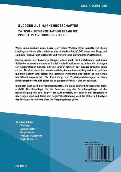 Wenn Luisa Eckhard alias 'Luisa Lion' ihrem Weblog Style-Roulette von ihrem Lieblingsparfüm erzählt, erfahren das im besten Fall 60.000 Leser des Blogs und 183.000 Follower auf Instagram und weitere Fans auf anderen Plattformen. Häufig lassen sich bekannte Blogger jedoch auch für Empfehlungen auf ihren Seiten im Internet und anderen Social Media-Plattformen bezahlen. Vor Anfragen für Kooperationen können sich die 'großen Namen' der Blogger-Branche kaum retten. Sie sind 'Menschen wie du und ich', die aus ihrem Alltag berichten, mit den gleichen Sorgen und Zielen wie 'normale' Menschen und haben so ein hohes Identifikationspotential. Die Einbindung von Produktplatzierungen in diese Erfahrungsberichte gilt daher als besonders effektiv - und authentisch. In diesem Buch wird die Frage beantwortet, wie Luisa Eckhard Authentizität sicherstellt. Die Grundlage für die Beantwortung der Forschungsfrage ist die Beschäftigung mit dem Begriff der Authentizität, der dann in die Blogosphäre übertragen wird. Auf Basis der Begriffsbestimmung wird die (Inhalts-) Analyse des Weblogs Aufschluss über die Ausgangsfrage geben. Aus dem Inhalt: - Weblogs; - Authentizität; - Bloganalyse;- Product Placement; - Style-Roulette