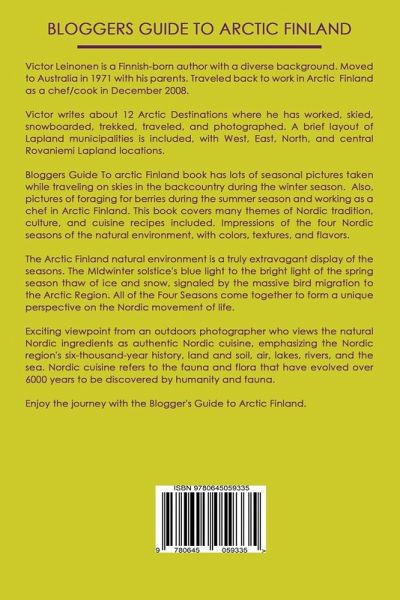 The Bloggers Guide To Arctic Finland is a compilation of the author's blog articles over 10 years. The first blog that Victor started was way back in 2009. That early blog was named Nordic Cuisine Focus. The blog content covers 12-holiday destinations in the Arctic Finland region that Victor enjoyed visiting, working at, photographing, and writing content on and publishing. The articles were focused mainly on the natural Nordic environment, Finland, regional produce, ingredients, nature, traditional culture, and cuisine. Finland's documented history of the last 1000 years is a fascinating resource to learn more about the people of the Nordic region. Finland has 600 years of modern history, 400 years under the rule of Swedish kings, 100 years under Russian rule, and 100 years of coexistence with Soviet Russia. The collective time that Finland's people have served under these foreign rulers for 500 years was never invited or voluntary. Victor writes about 12 Arctic Finland travel destinations where he has worked, skied, snowboarded, trekked, traveled, and photographed. A brief layout of Lapland municipalities is included, with West, East, North, and central Rovaniemi, Lapland. There are many Nordic cuisine-related pictures, travel routes, location maps, historical facts, and traditional Nordic Cuisine flavor recipes. A fascinating story with pictures and maps of how the 1939-1940 Baltic Sea blockade was diverted via the Arctic Sea Route to the Port of Petsamo in Arctic Finland supplies the city Rovaniemi. From there distributed throughout Finland and Sweden.