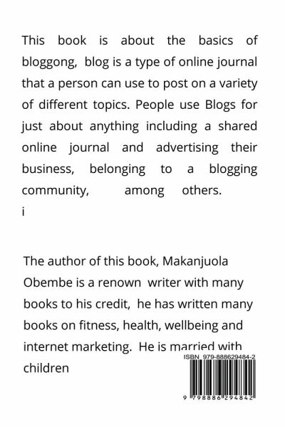 The book is about the basics of blogging, blog is a type of online journal that a person can use to post on a variety of different topics. People use Blogs for just about anything including a shared online journal and advertising their business, and belonging to bloging community among others