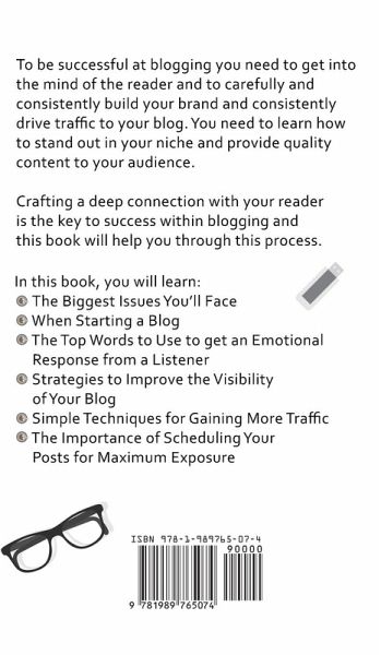 Are you curious why some bloggers make a small fortune while others struggle to get their blog off the ground? What tactics and strategies do those top bloggers use? One of the most significant problems with blogging is learning how to grow your audience and keep them engaged. Often blogs fail because they can’t get the traffic to their page irrespective of how good the blog is. The solution is to get into the mind of the reader and to carefully and consistently build your brand and consistently drive traffic to your blog. To be successful, you need to learn how to stand out in your niche and provide quality content to your audience. Crafting a deep connection with your readers is the key to success within blogging and this book will help you through this process. You will learn: ** The Biggest Issues You’ll Face When Starting a Blog ** The Top Words to Use to get an Emotional Response from a Listener ** Strategies to Improve the Visibility of Your Blog ** A Simple Technique for Gaining More Traffic ** The Importance of Scheduling Your Posts for Maximum Exposure This book is full of information that will help you grow your following, craft quality content that’s in demand and create an income of up to 5 figures or MORE. Even if you’re new to blogging or don’t think you have expert knowledge in a field this book will help you figure out your unique perspective and voice within a specific niche. Would You Like To Know More? Download now and take one step closer to your blogging destiny. Scroll to the top of the page and select the buy now button.