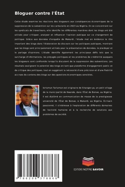 Cette étude examine les réactions des blogueurs aux conséquences économiques de la suppression de la subvention sur les carburants en 2023 au Nigéria. En se concentrant sur les syndicats de travailleurs, elle identifie les différentes manières dont les blogs ont été utilisés pour critiquer, analyser et influencer l'opinion publique sur ce changement de politique. Grâce aux données d'enquête de Makurdi, l'étude met en évidence le rôle important des blogs dans l'élaboration du discours sur les politiques publiques, montrant que les blogs sont principalement utilisés pour la présentation de données, le plaidoyer et le partage d'opinions. L'étude identifie également les principaux défis tels que la surcharge d'informations, les préjugés politiques et les problèmes de crédibilité auxquels les blogueurs sont confrontés lorsqu'ils discutent de la suppression des subventions. Les résultats soulignent le potentiel des blogs en tant que plateforme d'engagement public et de critique des politiques, tout en suggérant la nécessité d'une précision et d'une fiabilité accrues du contenu des blogs sur des questions économiques sensibles.