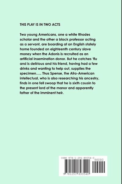 THIS PLAY IS IN TWO ACTS Two young Americans, one a white Rhodes scholar and the other a black professor acting as a servant, are boarding at an English stately home founded on eighteenth century slave money when the Adonis is recruited as an artificial insemination donor. But he catches 'flu and is delirious and his friend, having had a few drinks and wanting to help out, supplies the specimen..... Thus Spense, the Afro-American intellectual, who is also researching his ancestry, finds in one fell swoop that he is sixth cousin to the present lord of the manor and apparently father of the imminent heir.