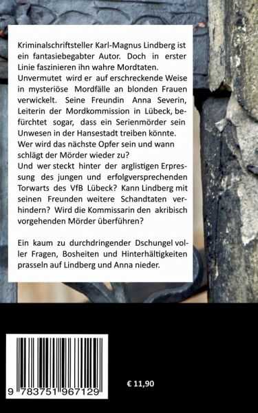 Kriminalschriftsteller Karl-Magnus Lindberg ist ein fantasiebegabter Autor. Doch in erster Linie faszinieren ihn wahre Mordtaten. Unvermutet wird er auf erschreckende Weise in mysteriöse Mordfälle an blonden Frauen verwickelt. Seine Freundin Anna Severin, Leiterin der Mordkommission in Lübeck, befürchtet sogar, dass ein Serienmörder sein Unwesen in der Hansestadt treiben könnte. Wer wird das nächstes Opfer sein und wann schlägt der Mörder erneut zu? Und wer steckt hinter der arglistigen Erpressung des jungen und erfolgversprechenden Torwarts des VfB Lübeck? Kann Lindberg mit seinen Freunden…mehr