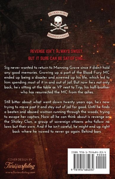 Revenge isn't always sweet, but it sure can be satisfying... Sig never wanted to return to Manning Grove since it didn't hold any good memories. Growing up a part of the Blood Fury MC ended up being a disaster and screwed up his life, which led to him spending most of it in and out of jail. But now he's not only back, he's sitting at the table as VP next to Trip, his half-brother who has resurrected the MC from the ashes. Still bitter about what went down twenty years ago, he's now trying to move past it and stay out of jail for good. Until he finds a beaten and abused woman running through the woods, trying to escape her captors. Now all he can think about is revenge on the Shirley Clan, a group of sovereign citizens who follow no laws but their own. And if he isn't careful, he might end up right back where he vowed to never go again. Behind bars. Note: Blood & Bones: Sig is the second book in the Blood Fury MC series. As always, this book has no cheating, no cliffhanger and has an HEA. It's recommended to read this series in order.