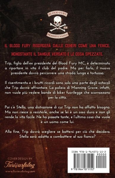 "Questi romanzi super sensuali vi terranno incollati alle pagine fino alla fine. Ho divorato ogni libro e ogni serie, ma non saprei dire qual è la mia storia preferita: sono tutte fantastiche!" ~ Carly Phillips, autrice di bestseller per il NY Times Il Blood Fury risorgerà dalle ceneri come una fenice, nonostante il sangue versato e le ossa spezzate. Trip, figlio dell'ex presidente del Blood Fury MC, è determinato a riportare in vita il club del padre. Ma per farlo, il nuovo presidente dovrà percorrere una strada lunga e tortuosa. Il risentimento e i brutti ricordi sono solo una parte degli ostacoli che Trip dovrà affrontare. La polizia di Manning Grove, infatti, non vuole più vedere bande di biker fuorilegge che scorrazzano per la città. Poi c'è Stella, una distrazione di cui Trip non ha affatto bisogno. Ma non riesce a resisterle, anche se lei è un osso duro e non gli rende la vita facile. Ne ha passate tante, e l'ultima cosa che vuole è un uomo come lui. Alla fine, Trip dovrà scegliere se battersi per ciò che desidera. Stella sarà adatta a combattere al suo fianco? Blood & Bones: Trip è il primo romanzo della serie Blood Fury MC. Come sempre, questo libro non contiene inganni, non presenta cliffhanger e ha un lieto fine. Si consiglia di leggere prima la serie Brothers in Blue, ma non è obbligatorio.