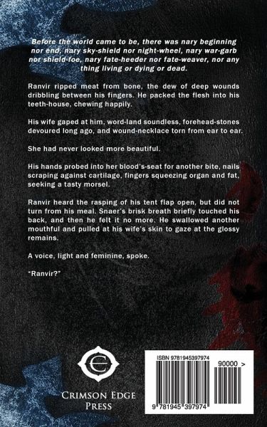 "Before the world came to be, there was nary beginning nor end, nary sky-shield nor night-wheel, nary war-garb nor shield-foe, nary fate-heeder nor fate-weaver, nor any thing living or dying or dead." Ranvir ripped meat from bone, the dew of deep wounds dribbling between his fingers. He packed the flesh into his teeth-house, chewing happily. His wife gaped at him, word-land soundless, forehead-stones devoured long ago, and wound-necklace torn from ear to ear. She had never looked more beautiful. His hands probed into her blood's-seat for another bite, nails scraping against cartilage, fingers…mehr