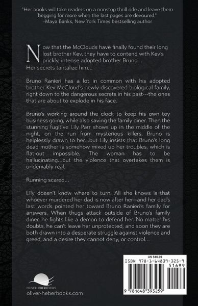 Now that the McClouds have finally found their long lost brother Kev, they have to contend with Kev's prickly, intense adopted brother Bruno... Her secrets tantalize him... Bruno Ranieri has a lot in common with his adopted brother Kev McCloud's newly discovered biological family, right down to the dangerous secrets in his past---the ones that are about to explode in his face. Bruno's working around the clock to keep his own toy business going, while also saving the family diner. Then the stunning fugitive Lily Parr shows up in the middle of the night, on the run from mysterious killers. Bruno is helplessly drawn to her...but Lily insists that Bruno's long dead mother is somehow mixed up her troubles, which is flat-out impossible. The woman has to be hallucinating...but the violence that overtakes them is undeniably real. Running scared... Lily doesn't know where to turn. All she knows is that whoever murdered her dad is now after her-and her dad's last words pointed her toward Bruno Ranieri's family for answers. When thugs attack outside of Bruno's family diner, he fights like a demon to defend her. No matter his doubts, he can't leave her unprotected, and soon they are both drawn into a desperate struggle against violence and greed, and a desire they cannot deny, or control...
