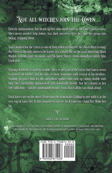 Dark, dangerous, magical men who live to annihilate evil. Not all witches join the Coven. Fiercely independent, Isla heads up her own small band in the San Francisco area. She's never needed help before, but dark sorcerers drive her and her group into hiding, trapping them. Sam's worked for the Coven as one of their enforcers forever. He's been there so long, the Coven is the only mistress he knows. It's a lonely life on the road thwarting wickedness and Black Magick with his guns, his magic, and his horse, but it's been enough to satisfy him. Until now. A group of witches is in deep trouble. They're not part of the Coven, but Sam is sworn to protect all witches and he rides to their assistance with several of his brothers. Nothing prepares him for the outspoken spitfire who ends up riding double with him. She's forthright, opinionated, and downright hostile, but he's drawn to her self-sufficiency-and her undeniable beauty. Soon, Isla is all he can think about. Dark forces are on the move. Protecting the woman he's falling in love with is at the very top of Sam's list. If they manage to survive, he'll tame her. Claim her. Make her his.