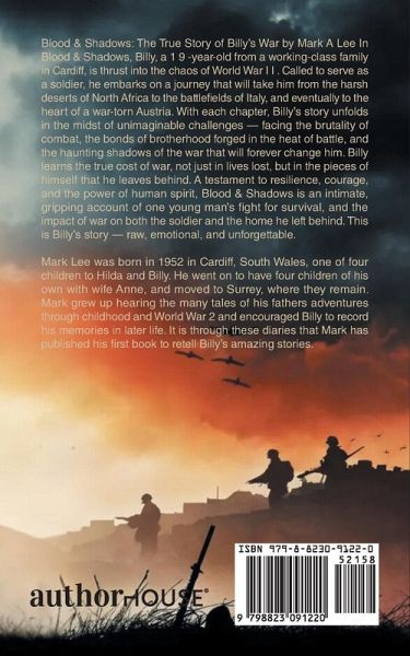 Blood & Shadows: The True Story of Billy's War by Mark A Lee In Blood & Shadows, Billy, a 1 9 -year-old from a working-class family in Cardiff, is thrust into the chaos of World War II . Called to serve as a soldier, he embarks on a journey that will take him from the harsh deserts of North Africa to the battlefields of Italy, and eventually to the heart of a war-torn Austria. With each chapter, Billy's story unfolds in the midst of unimaginable challenges - facing the brutality of combat, the bonds of brotherhood forged in the heat of battle, and the haunting shadows of the war that will forever change him. Billy learns the true cost of war, not just in lives lost, but in the pieces of himself that he leaves behind. A testament to resilience, courage, and the power of human spirit, Blood & Shadows is an intimate, gripping account of one young man's fight for survival, and the impact of war on both the soldier and the home he left behind. This is Billy's story - raw, emotional, and unforgettable.