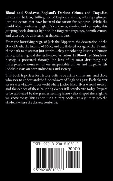 Blood and Shadows: England's Darkest Crimes and Tragedies unveils the hidden, chilling side of England's history, offering a glimpse into the events that have haunted the nation for centuries. While the world often celebrates England's conquests, royalty, and triumphs, this gripping book shines a light on the forgotten tragedies, horrific crimes, and catastrophic disasters that shaped its past. From the horrifying reign of Jack the Ripper to the devastation of the Black Death, the inferno of 1666, and the ill-fated voyage of the Titanic, these dark tales are not just stories-they are sobering lessons in human frailty, suffering, and the resilience of a nation. In Blood and Shadows, history is presented through the lens of its most disturbing and unforgettable moments, where unspeakable crimes and tragedies left indelible scars on both individuals and society. This book is perfect for history buffs, true crime enthusiasts, and those who seek to understand the hidden layers of England's past. Each chapter serves as a window into a world where justice failed, lives were shattered, and the echoes of these haunting events still reverberate today. Prepare to be captivated by the grim, unsettling history that shaped the England we know today. This is not just a history book-it's a journey into the shadows where the darkest stories lie.