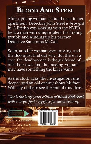 After a young woman is found dead in her apartment, Detective John Steel is brought in. A British cop working with the NYPD, he is a man with unique talent for finding trouble and winding up his partner, Detective Samantha McCall. Soon, another woman goes missing, and the duo must find out why. But there is a cost: the dead woman is the girlfriend of one their own, and the missing woman may have something the killer wants. As the clock ticks, the investigation runs deeper and an old enemy shows his face. Will any of them see the end of this alive? This is the large print edition of Blood And Steel, with a larger font / typeface for easier reading.