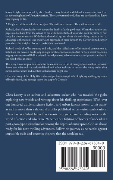Seven Knights are selected by their leader to stay behind and defend a mountain pass from an advancing horde of Saracen warriors. They are outnumbered, they are outclassed and know they're going to die. A Knight's code is moral, their duty just. They will never retreat. They will never surrender. Richard, their chosen leader can't accept the deaths of such good men. When their squires and pages double back from the retreat to die with them, Richard knows he must buy time to find a way for them to survive. With the odds stacked against them, the only thing they can turn to advantage is the terrain. The enemy can't approach en mass through the narrow slotted canyon pass where the Knights choose to make their final stand. Richard needs all of his cunning and wile, and the skilled arms of his trained companions to hold back the Saracen horde long enough for the army to escape. And he has a secret weapon, a mighty warrior named Ralf, a brigand turned penitent who seeks solace and penance washed in the blood of his enemies. This story is non stop action from the moment it starts, full of betrayal, love and lust for battle. Seven men who took an oath to defend each other and vow to protect the young under their care must face death and sacrifice so that others might live. Grab your copy of the Holy War today and get lost in an epic tale of fighting and forging bonds of brotherhood, and revenge set on the cusp of a Crusade.