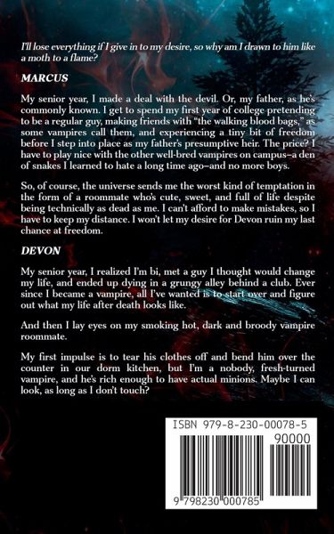 I'll lose everything if I give in to my desire, so why am I drawn to him like a moth to a flame? Marcus My senior year, I made a deal with the devil. Or, my father, as he's commonly known. I get to spend my first year of college pretending to be a regular guy, making friends with "the walking blood bags," as some vampires call them, and experiencing a tiny bit of freedom before I step into place as my father's presumptive heir. The price? I have to play nice with the other well-bred vampires on campus-a den of snakes I learned to hate a long time ago-and no more boys. So, of course, the…mehr