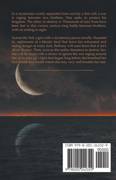 I'm running through a field of red flowers. My heart is thrashing in my chest, desperate to get away from the monster behind me. I can't breathe. Too bright, the sun blinds me. I begin to panic. How am I going to get away from the beast chasing me if I can't see? I have to keep going. I can't stop. My eyes are glued to the ground, the only thing I can see in this white light. The flowers, covered in the blood of the monster's victims, fade away behind me. The ground inclines sharply, some patch of grass grips hold of my toes. My knees hit the ground. No. In a mysterious world, separated from ours by a thin veil, a war is raging between two brothers. One seeks to protect his kingdom. The other, to destroy it. Thousands of fairy lives have been lost in this vicious century-long battle between brothers, with no ending in sight. Across the Veil, a girl with a mysterious power dwells. Haunted by nightmares of a bloody feud that leave her exhausted and seeing danger at every turn, Bethany will soon learn that it isn't all an illusion. Then, even as the reality threatens to destroy her, she will be faced with a choice: to ignore the war raging around her, or to take up a fight that began long before she breathed her first breath in a world where she may very well breathe her last.