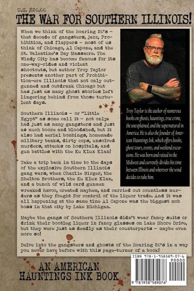 BLOOD, BULLETS AND BOOZE GHOSTS AND GANGSTERS OF SOUTHERN ILLINOIS When we think of the Roaring 20's - that decade of gangsters, jazz, Prohibition, and flappers - most of us think of Chicago, Al Capone, and the St. Valentine's Day Massacre. The Windy City has become famous for its one-way-rides and violent shootouts, but author Troy Taylor presents another part of Prohibition-era Illinois that not only outgunned and outdrank Chicago but has just as many ghost stories left lingering behind from those turbulent days. Southern Illinois - or "Little Egypt" as some call it - not only had just as many gangsters and just as much booze and bloodshed, but it also had aerial bombings, homemade military tanks, dirty cops, unsolved murders, attacks on hospitals, and gun battles with the Ku Klux Klan! Take a trip back in time to the days of the explosive Southern Illinois gang wars, when Charlie Birger, the Shelton Brothers, the Ku Klux Klan, and a bunch of wild card gunmen wreaked havoc, created mayhem, and carried out countless murders as they fought for control of the liquor trade. And it was all happening at the same time Al Capone was the biggest mob boss in that city by Lake Michigan. Maybe the gangs of Southern Illinois didn't wear fancy suits or drink their bootleg liquor in fancy glasses on Lake Shore Drive, but they were just as deadly as their counterparts - maybe even more so! Delve into the gangsters and ghosts of the Roaring 20's in a way you never have before with this page-turner of a book!