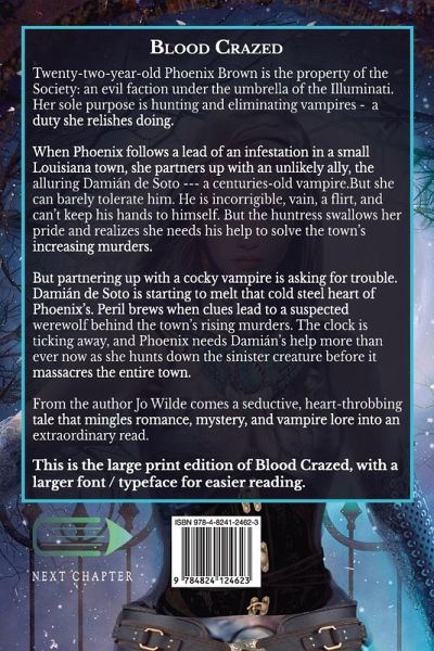 I always thought when my time came, I'd just die. No picking door number one or number two. But here I sit at crossroads of choices. Do I accept death, or do I choose to live a life as a creature I once despised? Twenty-two-year-old Phoenix Brown is the property of the Society: an evil faction under the umbrella of the Illuminati. Her sole purpose is hunting and eliminating vampires --- a duty she relishes doing. When Phoenix follows a lead of an infestation in a small Louisiana town, she partners up with an unlikely ally, the alluring Damián de Soto --- a centuries-old vampire. But she can barely tolerate him. He is incorrigible, vain, a flirt, and can't keep his hands to himself. But the huntress swallows her pride and realizes she needs his help to solve the town's increasing murders. But partnering up with a cocky vampire is asking for trouble. Damián de Soto is starting to melt that cold steel heart of Phoenix's. Peril brews when clues lead to a suspected werewolf behind the town's rising murders. The clock is ticking away, and Phoenix needs Damián's help more than ever now as she hunts down the sinister creature before it massacres the entire town. From the author Jo Wilde comes a seductive, heart-throbbing tale that mingles romance, mystery, and vampire lore into an extraordinary read. This is the large print edition of Blood Crazed, with a larger font / typeface for easier reading.