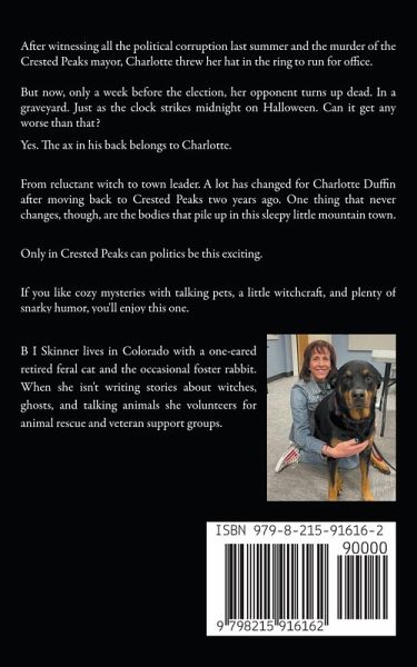 After witnessing all the political corruption last summer and the murder of the Crested Peaks mayor, Charlotte threw her hat in the ring to run for office. But now, only a week before the election, her opponent turns up dead. In a graveyard. Just as the clock strikes midnight on Halloween. Can it get any worse than that? Yes. The ax in his back belongs to Charlotte. From reluctant witch to town leader. A lot has changed for Charlotte Duffin after moving back to Crested Peaks two years ago. One thing that never changes, though, are the bodies that pile up in this sleepy little mountain town. Only in Crested Peaks can politics be this exciting. If you like cozy mysteries with talking pets, a little witchcraft, and plenty of snarky humor, you'll enjoy this one.