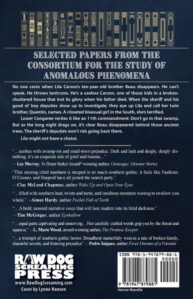 No one cares when Lila Carson's ten-year-old brother Beau disappears. He can't speak. He throws tantrums. He's a useless Carson, one of those kids in a broken-shuttered house that lost its glory when his father died. When the sheriff and his good ol' boy deputies show up to investigate, they eye up Lila and call her twin brother, Quentin, names. A closeted bisexual girl in the South, she's terrified. Lower Congaree recites it like an eleventh commandment: Don't go in that swamp. But as the long night drags on, it's clear Beau disappeared behind those ancient trees. The sheriff's deputies won't risk going back there. Lila might not have a choice. Advance Praise "With echoes of Lee's To Kill a Mockingbird, Eliza Broadbent's southern gothic, Blood Cypress, seethes with swamp-rot and small-town prejudice. Dark and lush and deeply, deeply disturbing, it's an exquisite tale of grief and trauma, solidifying Broadbent's place as a champion for the outsider. A revelation." -Lee Murray, five-time Bram Stoker Award®-winning author of Grotesque: Monster Stories "Elizabeth Broadbent discovers a creek that connects directly to Michael McDowell's Blackwater mythos, leading readers through this beautiful backwater novella. This missing child manhunt is steeped in so much southern gothic, it feels like Faulkner, O'Connor, and Sheperd have all joined the search party."-Clay McLeod Chapman, author Wake Up and Open Your Eyes "Mesmerizing! Broadbent weaves a tale about the pain of growing up 'different' and the desperation of a failing family legacy. Much like the swamp at its center, this story is filled with southern heat, twists and turns, and insidious monsters waiting to swallow you whole."-Aimee Hardy, author Pocket Full of Teeth "Like the dark swamp at its heart, this book melds Southern Gothic with folk horror in a delightful way. A bold, assured narrative voice that will lure readers into its fetid darkness."-Tim McGregor, author of Eynhallow "...equal parts captivating and unnerving...Her carefully crafted words grip you by the throat and squeeze."-L. Marie Wood, award-winning author of The Promise Keeper