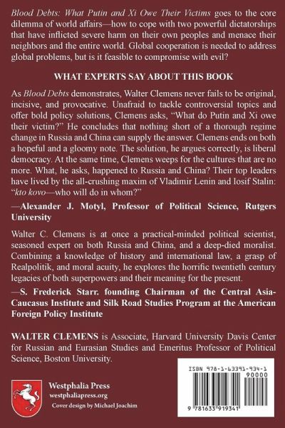 Blood Debts: What Putin and Xi Owe Their Victims goes to the core dilemma of world affairs-how to cope with two powerful dictatorships that have inflicted severe harm on their own peoples and menace their neighbors and the entire world. Global cooperation is needed to address global problems, but is it feasible to compromise with evil? WHAT EXPERTS SAY ABOUT THIS BOOK As Blood Debts demonstrates, Walter Clemens never fails to be original, incisive, and provocative. Unafraid to tackle controversial topics and offer bold policy solutions, Clemens asks, "What do Putin and Xi owe their victim?" He concludes that nothing short of a thorough regime change in Russia and China can supply the answer. Clemens ends on both a hopeful and a gloomy note. The solution, he argues correctly, is liberal democracy. At the same time, Clemens weeps for the cultures that are no more. What, he asks, happened to Russia and China? Their top leaders have lived by the all-crushing maxim of Vladimir Lenin and Iosif Stalin: "kto kovo-who will do in whom?" -Alexander J. Motyl, Professor of Political Science, Rutgers University Walter C. Clemens is at once a practical-minded political scientist, seasoned expert on both Russia and China, and a deep-died moralist. Combining a knowledge of history and international law, a grasp of Realpolitik, and moral acuity, he explores the horrific twentieth century legacies of both superpowers and their meaning for the present. -S. Frederick Starr. founding Chairman of the Central Asia-Caucasus Institute and Silk Road Studies Program at the American Foreign Policy Institute WALTER CLEMENS is Associate, Harvard University Davis Center for Russian and Eurasian Studies and Emeritus Professor of Political Science, Boston University.