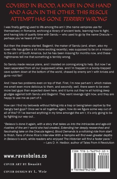 Covered in blood, a knife in one hand and a gun in the other. This rescue attempt has gone terribly wrong. Picking up from Blood Ex Libris's ending in an explosive-ravaged cave in the desert, Blood Demands takes Anushka "Noosh" Rossetti and Sandu (the supposedly-reformed Vlad Dracula) back to Romania, where Noosh assumes she will settle down to her archivist job for the am'r (vampires). But after the nightmares start, Noosh's life is disrupted yet again when she realizes that Bagamil, eldest of the am'r, is communicating to them that something has gone very wrong. Despite the dangers to one who is only half-vampire, Noosh insists on accompanying Sandu to travel to Argentina, asking the am'r of South America for clues to finding Bagamil. Everything points to Tierra del Fuego, where in a cave system filled with booby traps and two opposing sets of enemies, Noosh must discover how to help a poisoned Bagamil to freedom, and when captured, must somehow outlive her enemies in a melee of revenge-thirsty vampires from South America's colonial past. Despite intriguing allies and a bond with two of the most powerful am'r, Noosh must find her own way to survive in the brutal netherworld of the am'r. "Raven Belasco brings much to the table: a lively writing style, a fascinating take on the undead, a great deal of discreetly hidden scholarship, and a sheer joy in creativity which can sweep the reader along pell-mell. Come to these books for the hot sexytimes; stay for the sheer quality; linger for the quiet intelligence that underlies it all." - Chaz Brenchley, Author of The Books of Outremer, and the Crater School series
