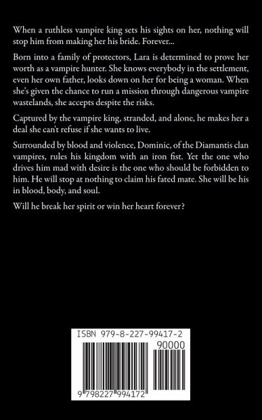 When a ruthless vampire king sets his sights on her, nothing will stop him from making her his bride. Forever... Born into a family of protectors, Lara is determined to prove her worth as a vampire hunter. She knows everybody in the settlement, even her own father, looks down on her for being a woman. When she's given the chance to run a mission through dangerous vampire wastelands, she accepts despite the risks. Captured by the vampire king, stranded, and alone, he makes her a deal she can't refuse if she wants to live. Surrounded by blood and violence, Dominic, of the Diamantis clan vampires, rules his kingdom with an iron fist. Yet the one who drives him mad with desire is the one who should be forbidden to him. He will stop at nothing to claim his fated mate. She will be his in blood, body, and soul. Will he break her spirit or win her heart forever?