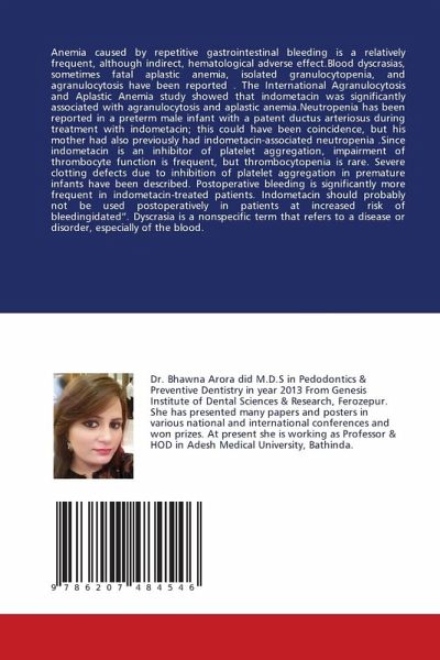 Anemia caused by repetitive gastrointestinal bleeding is a relatively frequent, although indirect, hematological adverse effect.Blood dyscrasias, sometimes fatal aplastic anemia, isolated granulocytopenia, and agranulocytosis have been reported . The International Agranulocytosis and Aplastic Anemia study showed that indometacin was significantly associated with agranulocytosis and aplastic anemia.Neutropenia has been reported in a preterm male infant with a patent ductus arteriosus during treatment with indometacin; this could have been coincidence, but his mother had also previously had indometacin-associated neutropenia .Since indometacin is an inhibitor of platelet aggregation, impairment of thrombocyte function is frequent, but thrombocytopenia is rare. Severe clotting defects due to inhibition of platelet aggregation in premature infants have been described. Postoperative bleeding is significantly more frequent in indometacin-treated patients. Indometacin should probably not be used postoperatively in patients at increased risk of bleedingidated". Dyscrasia is a nonspecific term that refers to a disease or disorder, especially of the blood.