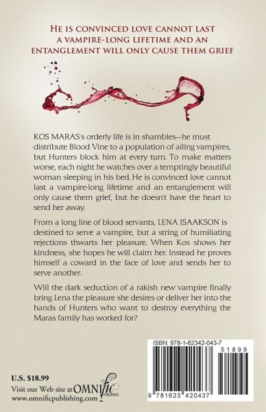 Kos Maras's orderly life is in shambles-he must distribute Blood Vine to a population of ailing vampires, but Hunters block him at every turn. To make matters worse, each night he watches over a temptingly beautiful woman sleeping in his bed. He is convinced love cannot last a vampire-long lifetime and an entanglement will only cause them grief, but he doesn't have the heart to send her away. From a long line of blood servants, Lena Isaakson is destined to serve a vampire, but a string of humiliating rejections thwarts her pleasure. When Kos shows her kindness, she hopes he will claim her. Instead he proves himself a coward in the face of love and sends her to serve another. Will the dark seduction of a rakish new vampire finally bring Lena the pleasure she desires or deliver her into the hands of Hunters who want to destroy everything the Maras family has worked for?