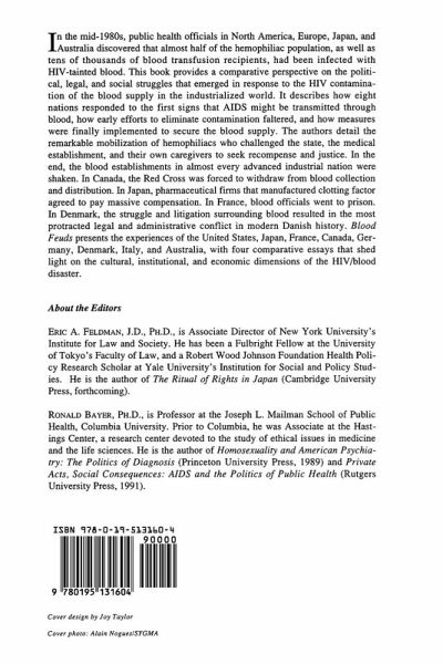 * Part I: National Encounters with Blood and AIDS * 1: Ronald Bayer and Eric Feldman: Introduction: Understanding the Blood Feuds * 2: Ronald Bayer: Blood and AIDS in America: Science, Politics, and the Making of an Iatrogenic Catastrophe * 3: Eric Feldman: HIV and Blood in Japan: Transforming Private Conflict into Public Scandal * 4: Monika Steffen: The Nations Blood: Medicine, Justice, and the State in France * 5: Norbert Gilmore and Margaret Somerville: From Trust to Tragedy: HIV / AIDS and the Canadian Blood System * 6: Erik Albaek: The Never-Ending Story? The Political and Legal Controversies over HIV and the Blood Supply in Denmark * 7: Stephan Dressler: Blood Scandal and AIDS in Germany * 8: Umberto Izzo: Blood, Bureaucracy and Law: Responding to the HIV-Tainted Blood in Italy * 9: John Ballard: HIV-Contaminated Blood and Australian Policy: The Limits of Success * Part II: Comparative Perspectives on the Politics of Medical Disaster * 10: Dorothy Nelkin: Cultural Perspectives on Blood * 11: David Kirp: The Politics of Blood: Hemophilia Activism in the AIDS Crisis * 12: Sherry Glied: The Circulation of the Blood: AIDS, Blood and the Economics of Information * 13: Theodore Marmor, Stephen Scher, and Patricia Dillon: Conclusion: The Comparative Politics of Contaminated Blood: From Hesitancy to Scandal