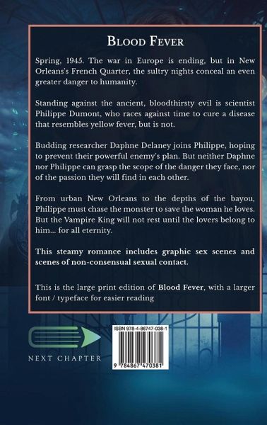 Spring, 1945. The war in Europe is ending, but in New Orleans's French Quarter, the sultry nights conceal an even greater danger to humanity. Standing against the ancient, bloodthirsty evil is scientist Philippe Dumont, who races against time to cure a disease that resembles yellow fever, but is not. Budding researcher Daphne Delaney joins Philippe, hoping to prevent their powerful enemy's plan. But neither Daphne nor Philippe can grasp the scope of the danger they face, nor of the passion they will find in each other. From urban New Orleans to the depths of the bayou, Philippe must chase the monster to save the woman he loves. But the Vampire King will not rest until the lovers belong to him... for all eternity. This steamy romance includes graphic sex scenes and scenes of non-consensual sexual contact. This is the large print edition of Blood Fever, with a larger font / typeface for easier reading.¿