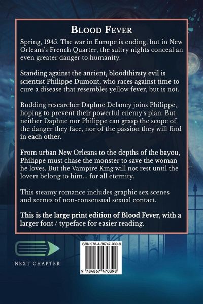 Spring, 1945. The war in Europe is ending, but in New Orleans's French Quarter, the sultry nights conceal an even greater danger to humanity. Standing against the ancient, bloodthirsty evil is scientist Philippe Dumont, who races against time to cure a disease that resembles yellow fever, but is not. Budding researcher Daphne Delaney joins Philippe, hoping to prevent their powerful enemy's plan. But neither Daphne nor Philippe can grasp the scope of the danger they face, nor of the passion they will find in each other. From urban New Orleans to the depths of the bayou, Philippe must chase the monster to save the woman he loves. But the Vampire King will not rest until the lovers belong to him... for all eternity. This steamy romance includes graphic sex scenes and scenes of non-consensual sexual contact. This is the large print edition of Blood Fever, with a larger font / typeface for easier reading.¿