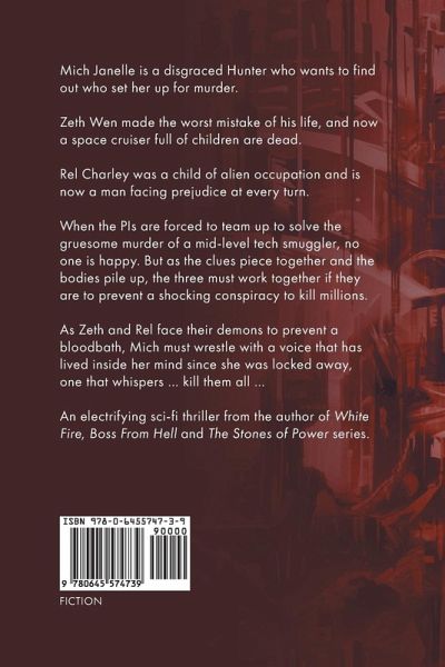 Mich Janelle is a disgraced Hunter who wants to find out who set her up for murder. Zeth Wen made the worst mistake of his life, and now a space cruiser full of children are dead. Rel Charley was a child of alien occupation and is now a man facing prejudice at every turn. When the PIs are forced to team up to solve the gruesome murder of a mid-level tech smuggler, no one is happy. But as the clues piece together and the bodies pile up, the three must work together if they are to prevent a shocking conspiracy to kill millions. As Zeth and Rel face their demons to prevent a bloodbath, Mich must wrestle with a voice that has lived inside her mind since she was locked away, one that whispers ... kill them all ... An electrifying sci-fi thriller from the author of White Fire, Boss From Hell and The Stones of Power series.
