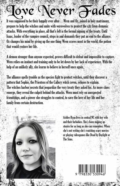Love Never Fades It was supposed to be their happily ever after... Wren and Oz, joined in holy matrimony, prepare to help the witches and unite with werewolves to protect the city from demonic attacks. With everything in place, all that's left is the formal signing of the treaty. Until Isaac, leader of the vampire council, steps in and demands they put an end to the alliance. Oz changes his mind by giving up the one thing Wren craves most in the world, the potion that would restore her life. A demon stronger than anyone expected, proves difficult to defeat and impossible to capture. Wren relies on instinct and training only to be let down by her lack of experience. With the help of an unlikely ally, she learns to believe in herself once again. The alliance spells trouble as the species fight to protect witches, until they discover a pattern that Sophie, the Priestess of the Callery witch coven, refuses to explain. The witches harbor secrets that jeopardize the very treaty they asked for. As everything falls into place, they reveal the culprit behind the attacks. Wren must rely on unexpected friendships, and a power she struggles to control, to save the love of her life and her family from certain destruction.