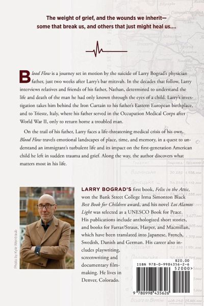 Blood Flow is a journey set in motion by the suicide of Larry Bograd's physician father, just two weeks after Larry's bar mitzvah. In the decades that follow, Larry interviews relatives and friends of his father, Nathan, determined to understand the life and death of the man he had only known through the eyes of a child. Larry's investigation takes him behind the Iron Curtain to his father's Eastern European birthplace, and to Trieste, Italy, where his father served in the Occupation Medical Corps after World War II, only to return home a troubled man. On the trail of his father, Larry faces a life-threatening medical crisis of his own. Blood Flow travels emotional landscapes of place, time, and memory, in a quest to understand an immigrant's turbulent life and its impact on the first-generation American child he left in sudden trauma and grief. Along the way, the author discovers what matters most in his life.