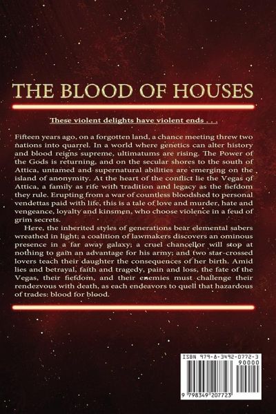 Game of Thrones with Lightsabers A secret is trivial for one, adequate for two, and fatal for three. There's power in blood. Such is the legacy of House Vega, a Sovereign fiefdom standing on the brink against General Basil Zeren of Taras. There, Jase Vega of Attica declares neutrality in his family's war, in vein and virtue. A militant pacifist, he ventures beyond the neon city to train his clandestine daughter, Seva, how to wield their inherited powers: the roaring tides of Hydrokinesis and the collateral-inducing damage of Super Strength. Far across the Royal Strait, along the secular shores of Siteia, lie devote conjurers and more-an innate power severed from the dynastic kings during the generation-long uprising, yet emerging with grievous consequences and divine authority not seen in centuries. But a more civil disturbance rises to the east, where Shoshana Vega, the General of War, has decreed an ultimatum for her heretic brother: join the destructive conflict or face execution for treason. Now, Basil is charging west to Attica, bringing his daughter, the apostatized but fierce Rome, her daughter, the infamous, immeasurable acolyte Seva, and the indomitable genetic powers of House Zeren-the first an inferno like Dragon's breath, the second a psionic enhancement of hearing. All are colliding in Attica, unaware of a fifteen-year mystery condemning Seva's birthright that will link the two feuding houses in blood forever. Game of Thrones with lightsabers in Blood for Blood, Volume One Part I, in the Series The Blood of Houses. Part II is now available. This novel features supernatural abilities, battle sequences, and political intrigue.