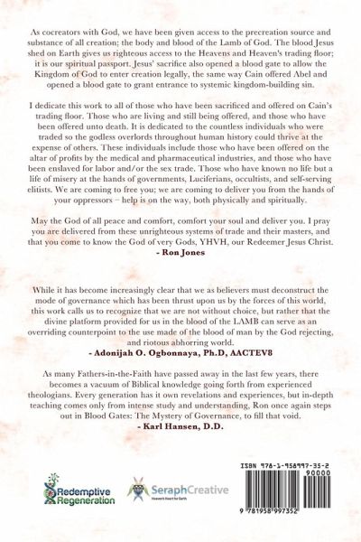 Our routine and seemingly benign participation in the way life is today and our supportive contributions to these normalized systemic processes, results in a win-win scenario for those who orchestrate these local to global affairs. From the safety of their homes and offices they legislate to shed innocent blood on the premise of protecting a nation or reproductive rights, and then unbeknownst to the rest of us, use that blood to open demonic pathways to increase themselves and their place in the world. - Ron Jones While it has become increasingly clear that we as believers must deconstruct the mode of governance which has been thrust upon us by the forces of this world, this work calls us to recognize that we are not without choice, but rather that the divine platform provided for us in the blood of the LAMB can serve as an overriding counterpoint to the use made of the blood of man by the God rejecting, and riotous abhorring world. - Adonijah O. Ogbonnaya, Ph.D, AACTEV8 As many Fathers-in-the-Faith have passed away in the last few years, there becomes a vacuum of Biblical knowledge going forth from experienced theologians. Every generation has it own revelations and experiences, but in-depth teaching comes only from intense study and understanding, Ron once again steps out in Blood Gates: The Mystery of Governance, to fill that void. - Karl Hansen, D.D. I was blown away by the revelation of the importance of the blood covenant through the Lamb, who was slain before the foundation of the world. This confirmed for me that the blood covenant gives us access to the governmental authority to do the "greater works" Jesus spoke of in John 14:12. In these last days, Ron's book is a crucial and timely message for the body of Christ. - Adam F. Thompson, International Prophetic Ministry All the principles of operation, resources, and technologies of the spirit realm are more advanced than those we currently see in this earthly matrix. By instituting the principles Ron lays out in this book, we will discover YHVH has equipped us with more than enough for the journey. Enough to be overcomers and win! - David L. Ramer, M. Div, Glory Fire Church Blood Gates in an exceptional book. From the very start, you will be captivated and drawn into new dimensions of wisdom, revelation, and truth. Through his research, revelation, and intimacy with Yahweh, Ron releases truths and revelations that serve to move us out of our old religious mindsets, beliefs, and pathways, into awe and amazement of Yahweh and ourselves. - Dr. Etienne Blom, Kingdom Fire Ministries