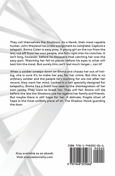 War is coming. Protests against chem-treatments are turning into bloody riots, and soldiers patrol the streets in every major city. It’s only a matter of time before the resistants, those unaffected by the treatments, band together and turn on everyone else. Senator Griffith has been preparing for it. He has created an army so powerful and dedicated that rumors of it are used to scare little children into behaving. They call themselves the Shadows. As a Hawk, their most capable hunter, John Wayland has a new assignment to complete: Capture a telepath. Emma Calen is easy prey. A young girl on the run from the law, cut off from her own people, she falls right into his clutches. It isn’t long, however, before he discovers that catching her was the easy part. Watching her fall to pieces before his eyes is what will test him the most. But surely this can’t last much longer… can it? When a soldier sweeps down on Emma and chases her out of hiding, she’s sure it’s to make her pay for her crime. But this is no ordinary soldier, and the people he’s working for are not after her record, they want her mind. Locked in a hell specially designed for telepaths, Emma has a front row seat to the disintegration of her own sanity. They want to break her. They will fail. Emma will die before she lets the Shadows use her against her family and friends. But maybe there is still hope for her. A delicate, fragile sliver of hope in the most unlikely place of all. The Shadow Hawk guarding the door.