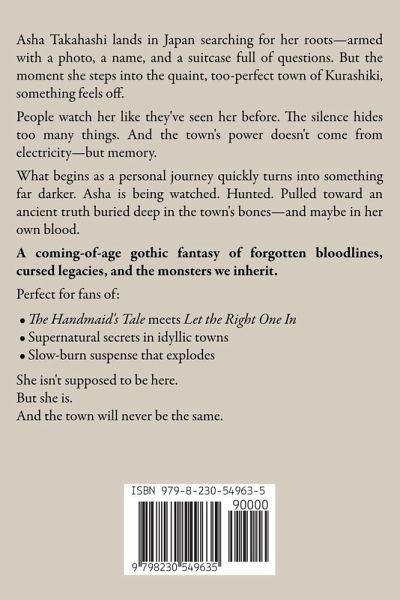 Asha Takahashi lands in Japan searching for her roots-armed with a photo, a name, and a suitcase full of questions. But the moment she steps into the quaint, too-perfect town of Kurashiki, something feels off. People watch her like they've seen her before. The silence hides too many things. And the town's power doesn't come from electricity-but memory. What begins as a personal journey quickly turns into something far darker. Asha is being watched. Hunted. Pulled toward an ancient truth buried deep in the town's bones-and maybe in her own blood. A coming-of-age gothic fantasy of forgotten bloodlines, cursed legacies, and the monsters we inherit. Perfect for fans of:The Handmaid's Tale meets Let the Right One In Supernatural secrets in idyllic towns Slow-burn suspense that explodes She isn't supposed to be here. But she is. And the town will never be the same.