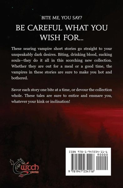Bite me, you say? Be careful what you wish for… These searing vampire short stories go straight to your unspeakably dark desires. Biting, drinking blood, sucking souls—they do it all in this scorching new collection. Whether they are out for a meal or a good time, the vampires in these stories are sure to make you hot and bothered. Savor each story one bite at a time, or devour the collection whole. These tales are sure to entice and ensnare you, whatever your kink or inclination!