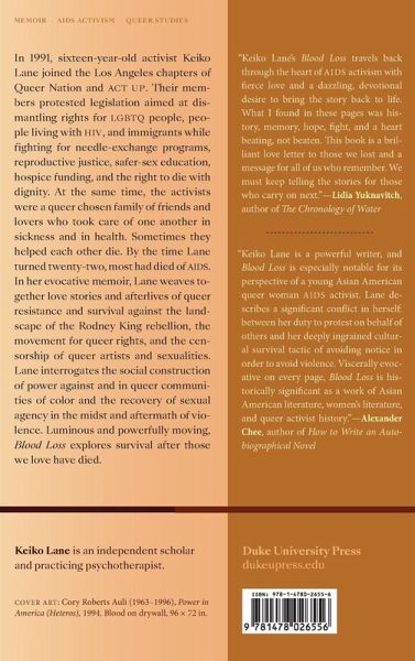 In 1991, sixteen-year-old activist Keiko Lane joined the Los Angeles chapters of Queer Nation and ACT UP. Their members protested legislation aimed at dismantling rights for LGBTQ people, people living with HIV, and immigrants while fighting for needle-exchange programs, reproductive justice, safer-sex education, hospice funding, and the right to die with dignity. At the same time, the activists were a queer chosen family of friends and lovers who took care of one another in sickness and in health. Sometimes they helped each other die. By the time Lane turned twenty-two, most had died of AIDS. In her evocative memoir, Lane weaves together love stories and afterlives of queer resistance and survival against the landscape of the Rodney King Rebellion, the movement for queer rights, and the censorship of queer artists and sexualities. Lane interrogates the social construction of power against and in queer communities of color and the recovery of sexual agency in the midst and aftermath of violence. Luminous and powerfully moving, Blood Loss explores survival after those we love have died.