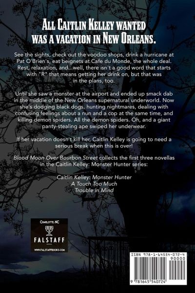 All Caitlin Kelley wanted was a vacation in New Orleans. See the sights, check out the voodoo shops, drink a hurricane at Pat O'Brien's, eat beignets at Cafe du Monde, the whole deal. Rest, relaxation, and...well, there isn't a good word that starts with "R" that means getting her drink on, but that was in the plans, too. Until she saw a monster at the airport and ended up smack dab in the middle of the New Orleans supernatural underworld. Now she's dodging black dogs, hunting nightmares, dealing with confusing feelings about a nun and a cop at the same time, and killing demon spiders. All the demon spiders. Oh, and a giant panty-stealing ape swiped her underwear. If her vacation doesn't kill her, Caitlin Kelley is going to need a serious break when this is over! Blood Moon Over Bourbon Street collects the first three novellas in the Caitlin Kelley: Monster Hunter series - Caitlin Kelley: Monster Hunter A Touch Too Much Trouble in Mind